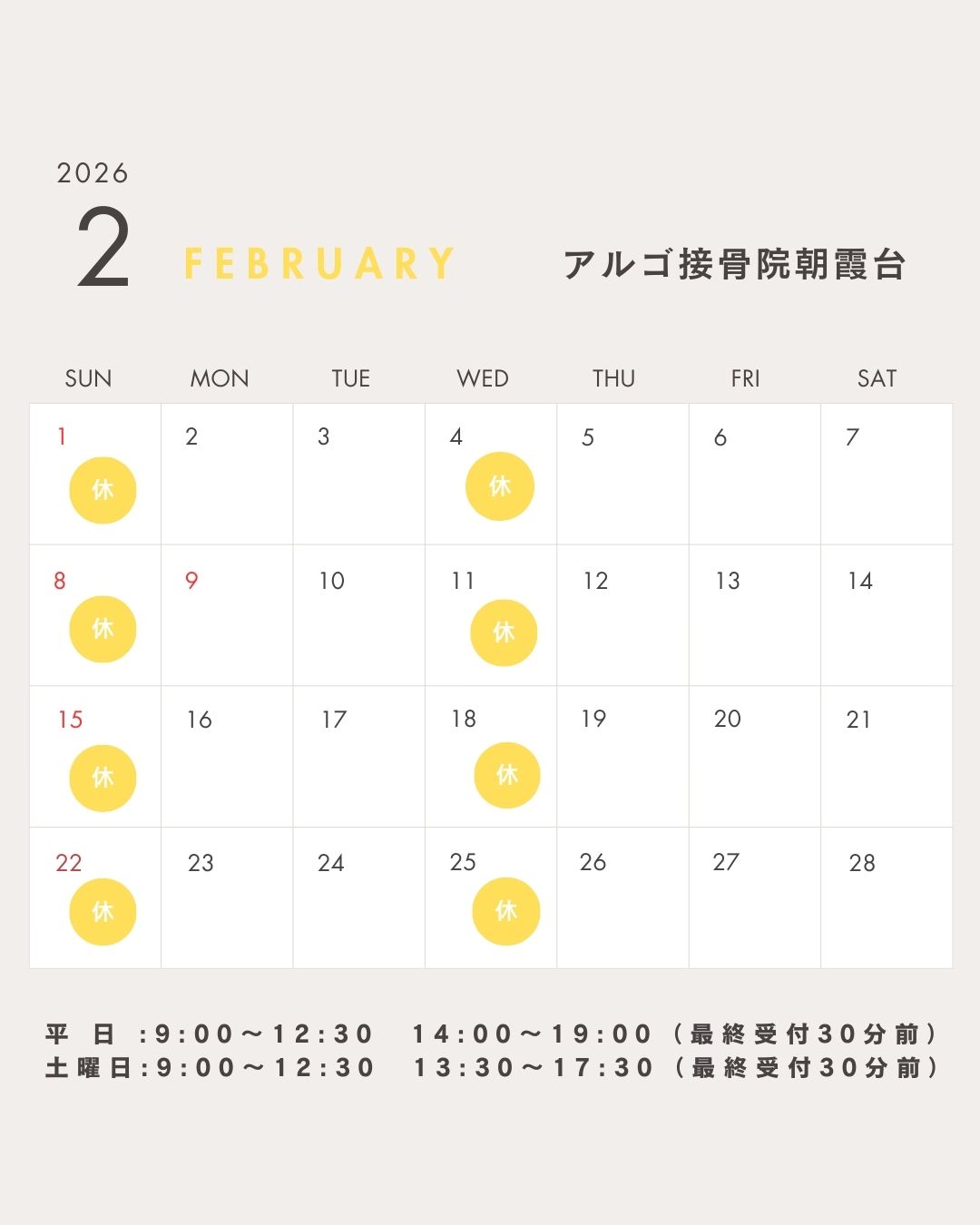 アルゴ接骨院朝霞台 2月の営業カレンダー