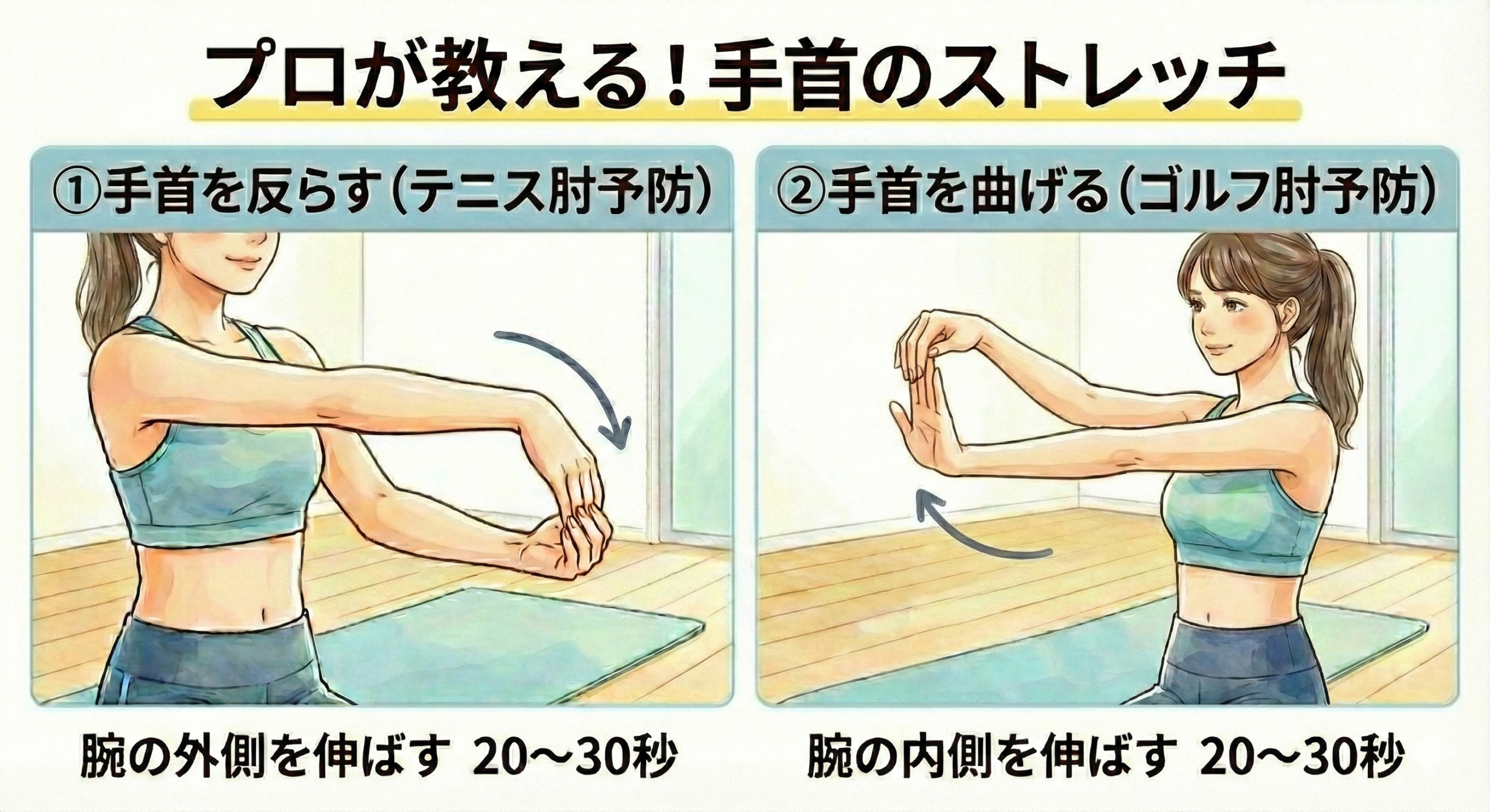 今回は、肘のトラブルを未然に防ぐための「手首のストレッチ」について解説します。