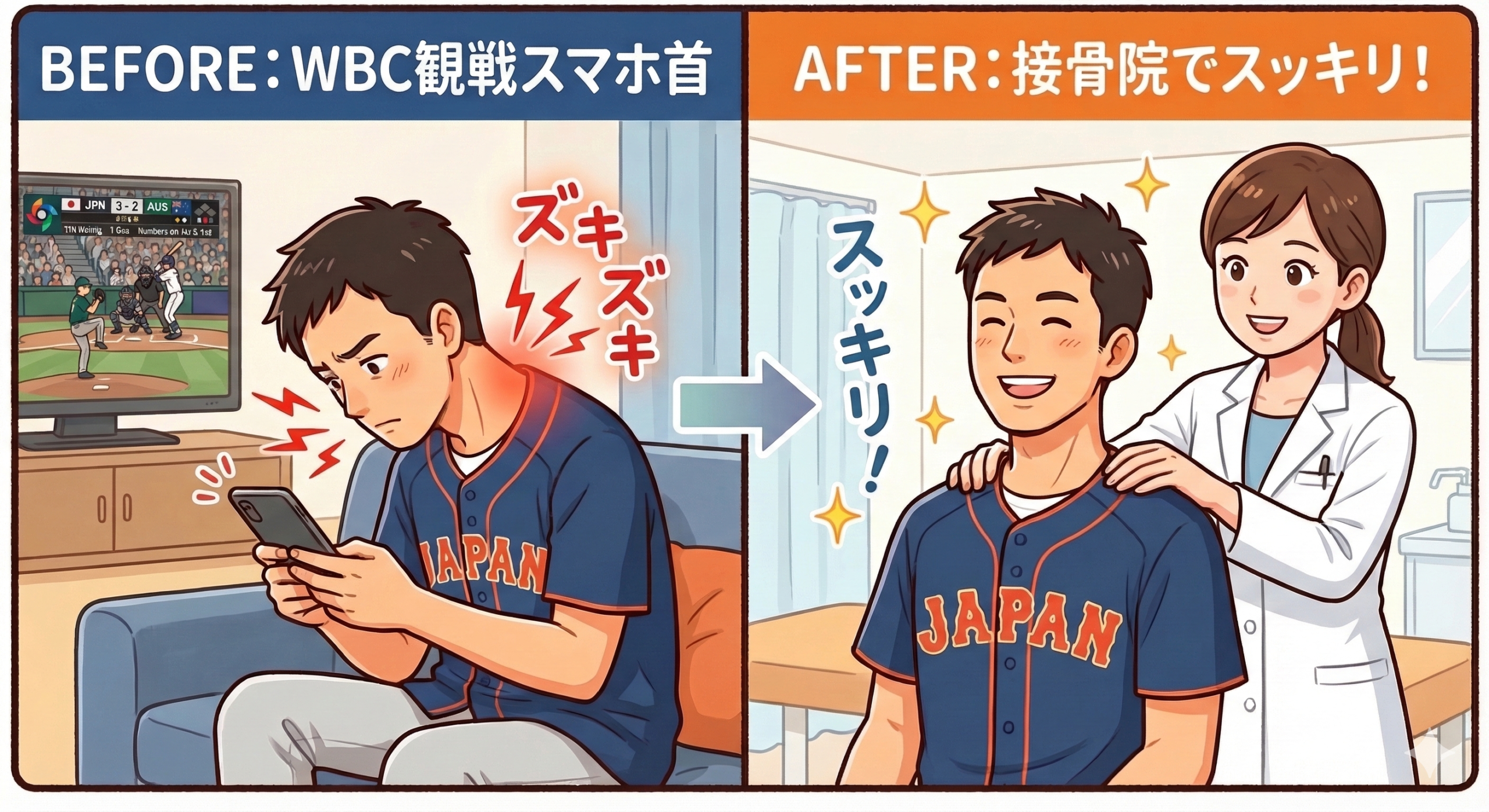 それは、**「WBC観戦による深刻な首・肩の疲れ」**です。